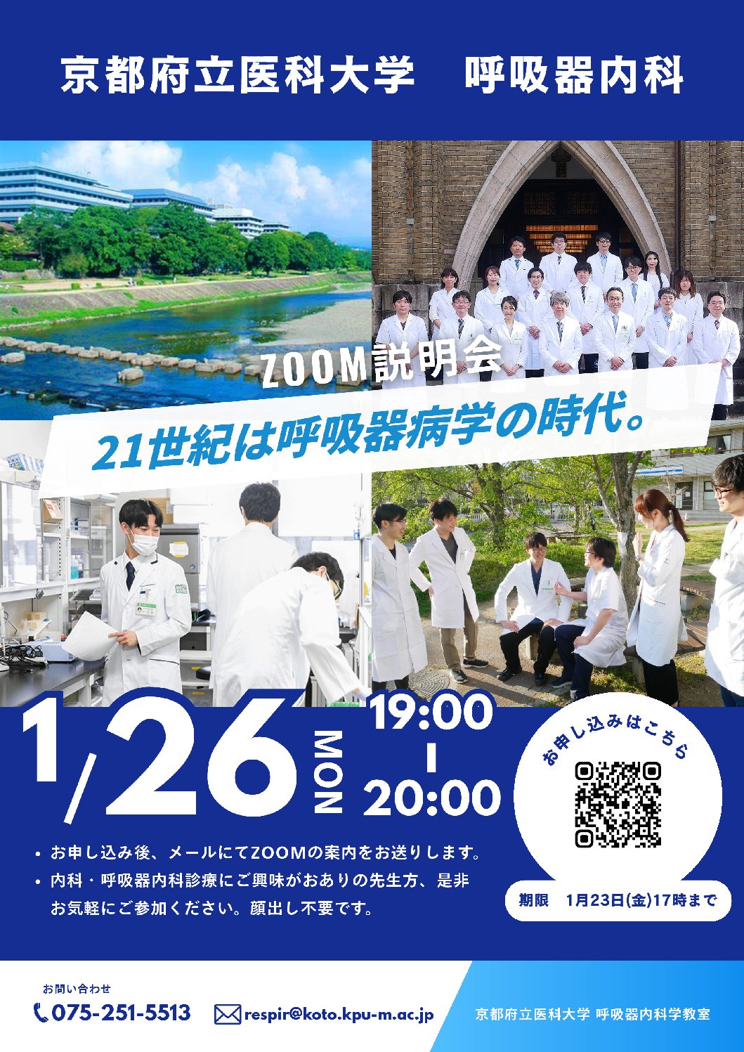 京都府立医大呼吸器内科では、定期的に医局説明会を開催しています.来年度入局に向けた第4回説明会は1月26日(月)に開催予定です.zoom上で顔出し不要で参加できますので(もちろん出していただいても構いません)、お気軽に参加ください.参加申込は下記フォームから!*締切は1月23日まで 応募フォームはこちらをクリック(google フォームが開きます)