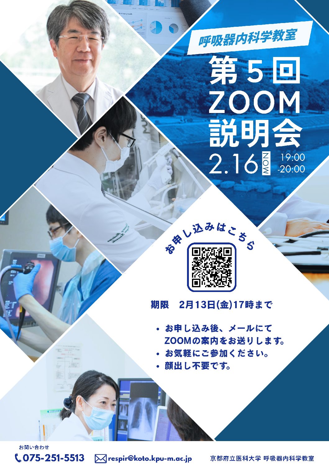 京都府立医大呼吸器内科では、定期的に医局説明会を開催しています.来年度入局に向けた第5回説明会は2月16日(月)に開催予定です.zoom上で顔出し不要で参加できますので(もちろん出していただいても構いません)、お気軽に参加ください.参加申込は下記フォームから!*締切は2月13日まで 応募フォームはこちらをクリック(google フォームが開きます)