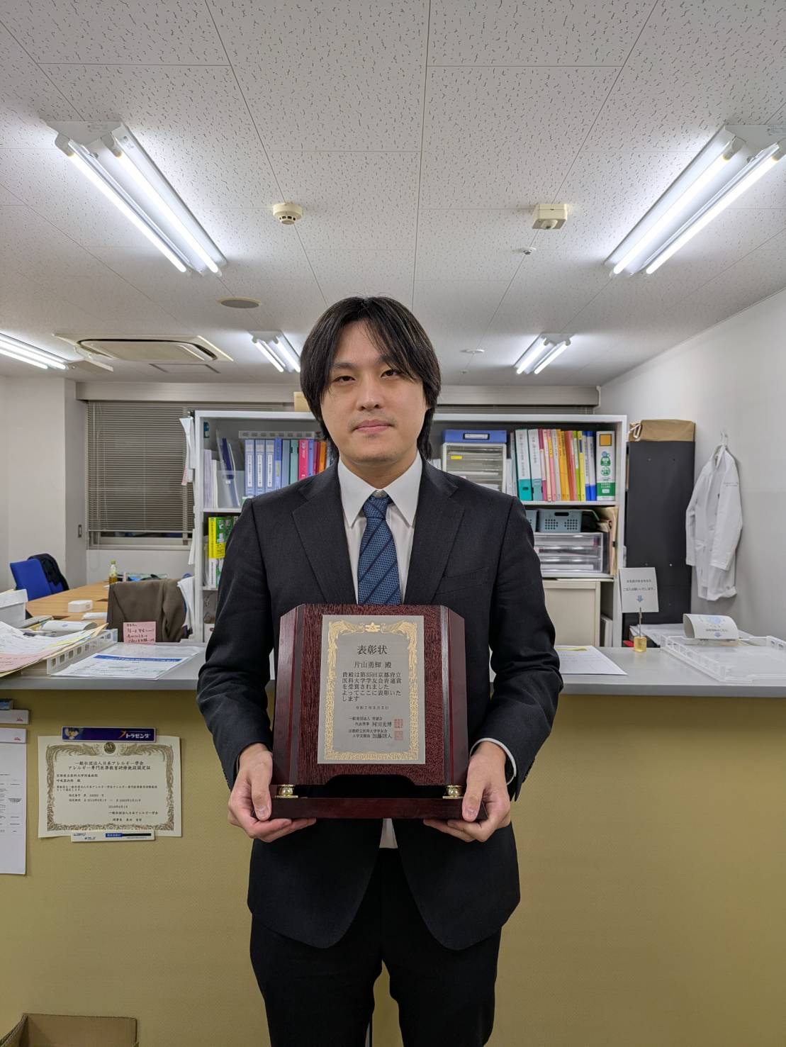 助教の片山です。 先日、第35回京都府立医科大学学友会青蓮賞にご採択いただき、2025年3月5日に執り行われました青蓮賞授賞式および受賞記念講演会で青蓮賞を受賞いたしました。 この度は大変名誉ある賞を受賞することができ、ご協力およびご指導いただきました先生方には心より感謝申し上げます。 今後ともご指導ご鞭撻のほど、どうぞよろしくお願いいたします。