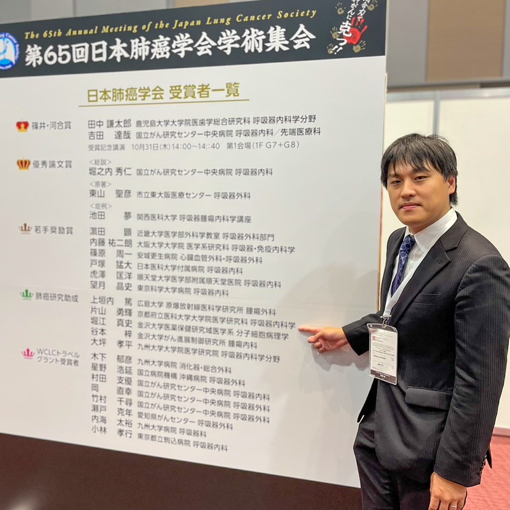 コメント:この度、日本肺癌学会若手奨励賞を受賞いたしました。山田先生を始め、ご指導頂いた先生方に深く感謝致します。これを励みに一層努力して参りたいと思います。今後ともよろしくお願い致します。